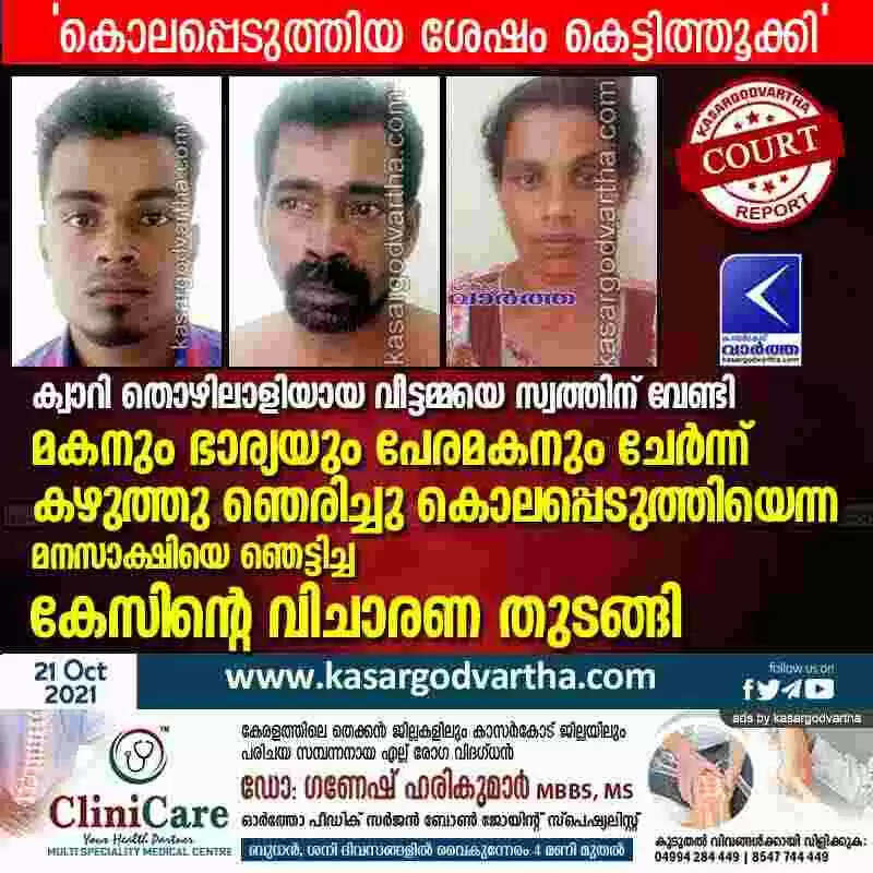 ബേഡകം: (www.kasargodvartha.com 21.10.2021) ക്വാറി തൊഴിലാളിയായ വീട്ടമ്മയെ സ്വത്ത് സംബന്ധമായ തര്‍ക്കത്തെ തുടര്‍ന്ന് മകനും മകൻ്റെ ഭാര്യയും പേരമകനും ചേർന്ന് കഴുത്ത് ഞെരിച്ചു കൊലപ്പെടുത്തിയെന്ന മനസാക്ഷിയെ ഞെട്ടിച്ച കേസിൻ്റെ വിചാരണ കാസർകോട് ജില്ലാ സെഷൻസ് കോടതി (ഒന്ന്) യിൽ ആരംഭിച്ചു.