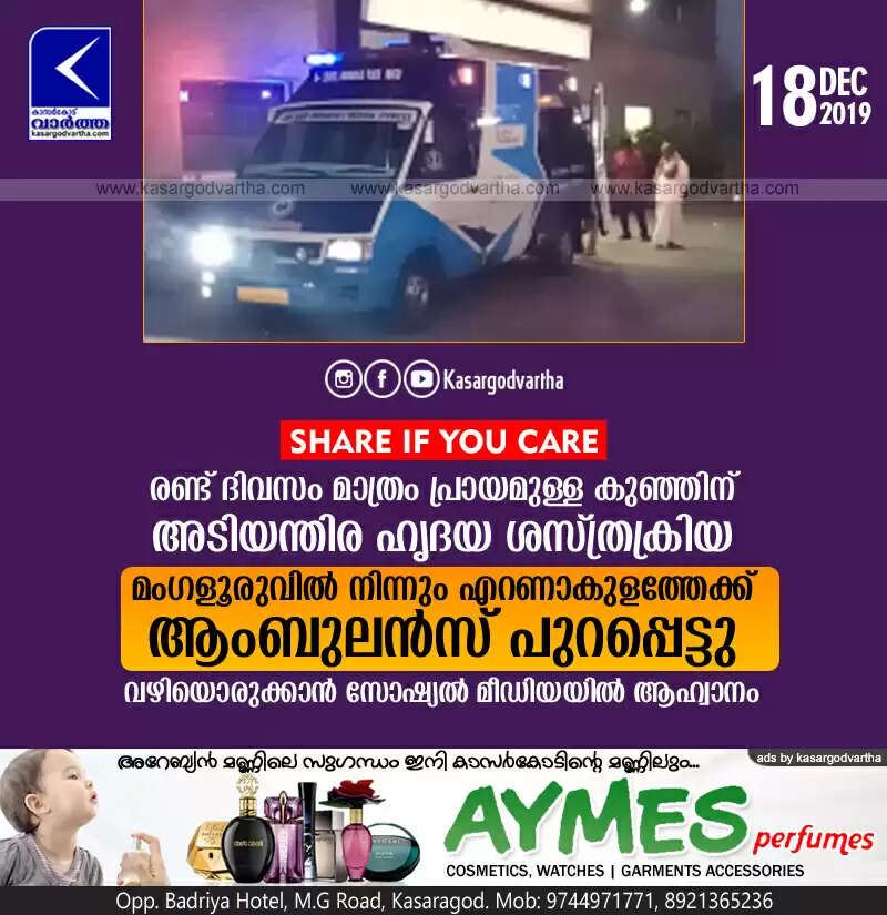 രണ്ട് ദിവസം മാത്രം പ്രായമുള്ള കുഞ്ഞിന് അടിയന്തിര ഹൃദയ ശസ്ത്രക്രിയ; മംഗളൂരുവില് നിന്നും എറണാകുളത്തേക്ക് ആംബുലന്സ് പുറപ്പെട്ടു, വഴിയൊരുക്കാന് സോഷ്യല് മീഡിയയില് ആഹ്വാനം