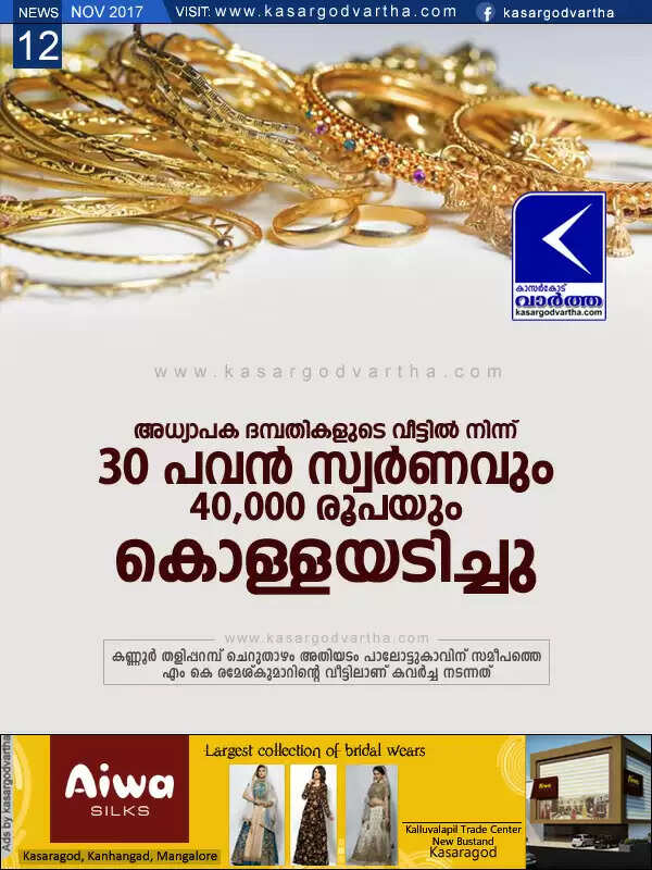 അധ്യാപക ദമ്പതികളുടെ വീട്ടില് നിന്ന് 30 പവന് സ്വര്ണവും 40,000 രൂപയും കൊള്ളയടിച്ചു