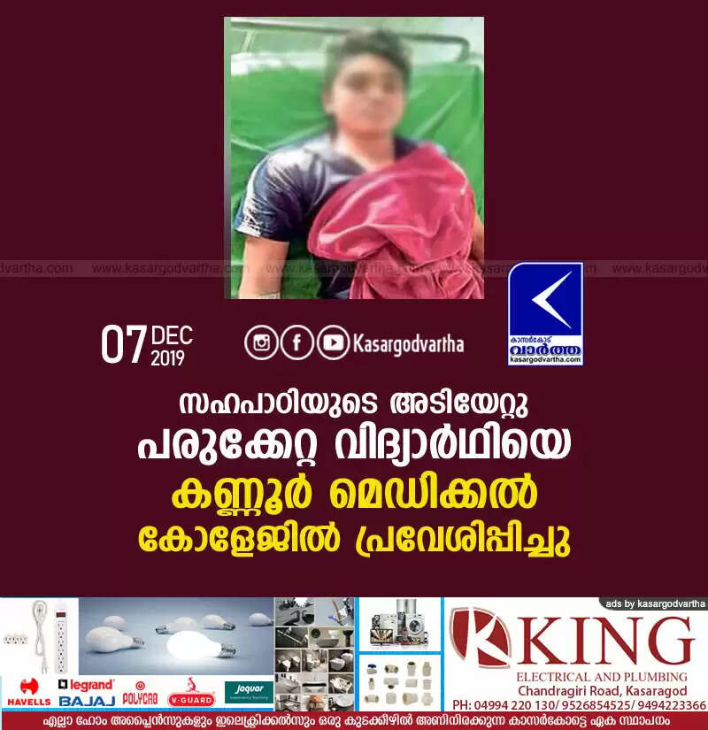 സഹപാഠിയുടെ അടിയേറ്റു പരുക്കേറ്റ വിദ്യാര്‍ഥിയെ കണ്ണൂര്‍ മെഡിക്കല്‍ കോളേജില്‍ പ്രവേശിപ്പിച്ചു
