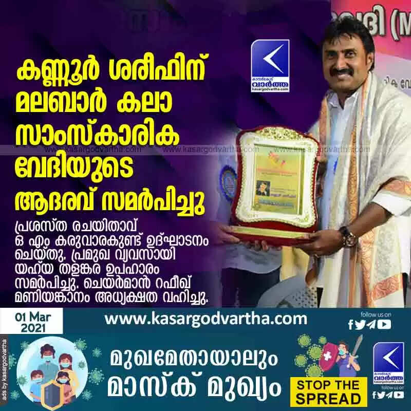 Keywords: Kerala, News, Kasaragod, Folklore Award, Shareef Kannur, Malabar Arts and Culture Vedhi, Yahya Thalangara, Felicitation, Malabar Arts and Culture Venue felicitates Kannur Sharif.