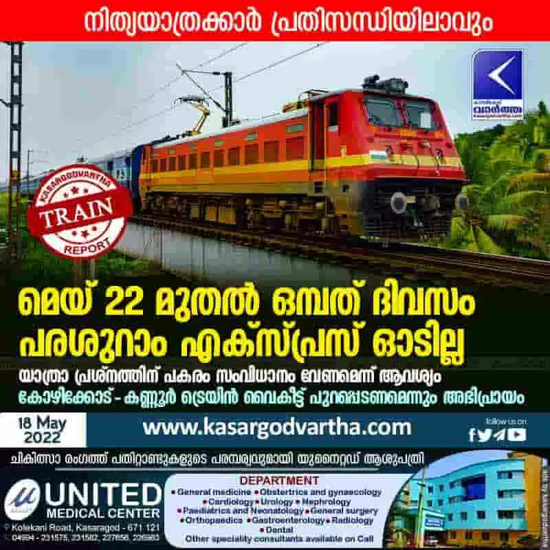 Keywords: News, Kerala, Kasaragod, Top-Headlines, Train, Railway, Passenger, Kozhikode, Kannur, Travel, Parasuram Express, Parasuram Express will not run for nine days from May 22.