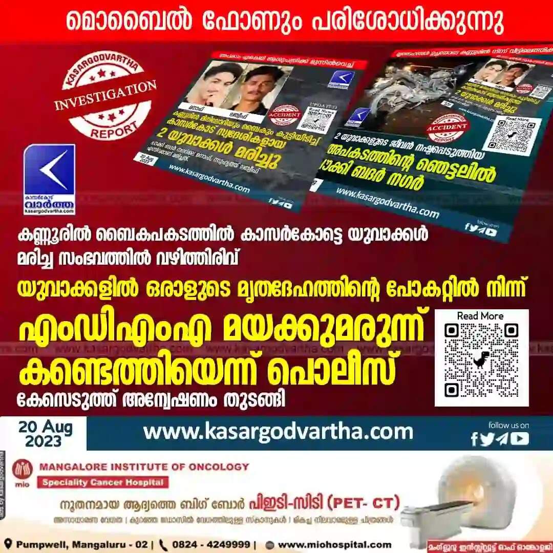 Investigation | കണ്ണൂരില്‍ ബൈകപകടത്തില്‍ കാസര്‍കോട്ടെ യുവാക്കള്‍ മരിച്ച സംഭവത്തില്‍ വഴിത്തിരിവ്; യുവാക്കളില്‍ ഒരാളുടെ മൃതദേഹത്തിന്റെ പോകറ്റില്‍ നിന്ന് എംഡിഎംഎ മയക്കുമരുന്ന് കണ്ടെത്തിയെന്ന് പൊലീസ്; കേസെടുത്ത് അന്വേഷണം തുടങ്ങി; മൊബൈല്‍ ഫോണും പരിശോധിക്കുന്നു