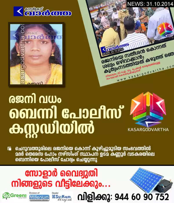കാഞ്ഞങ്ങാട്: (www.kasargodvartha.com 31.10.2014) ചെറുവത്തൂരിലെ മദര്‍ തെരേസ ഹോം നഴ്‌സിംഗ് സ്ഥാപന നടത്തിപ്പുകാരി രജനിയുടെ കൊലപാതകവുമായി ബന്ധപ്പെട്ട് വടകര സ്വദേശിയെ പോലീസ് കസ്റ്റഡിയിലെടുത്തു. മദര്‍ തെരേസ ഹോം നഴ്‌സിംഗ് സ്ഥാപന ഉടമ വടകരയിലെ ബെന്നിയെയാണ് നീലേശ്വരം പോലീസ് കസ്റ്റഡിയിലെടുത്തത്.