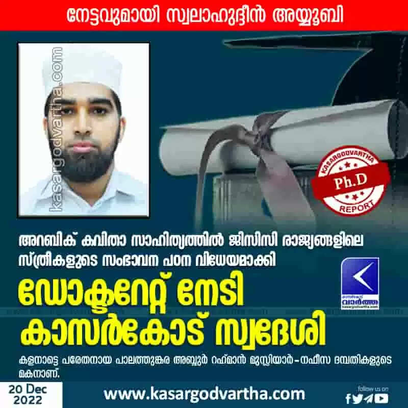 Ph.D | അറബിക് കവിതാ സാഹിത്യത്തിൽ ജിസിസി രാജ്യങ്ങളിലെ സ്ത്രീകളുടെ സംഭാവന പഠന വിധേയമാക്കി ഡോക്ടറേറ്റ് നേടി കാസർകോട് സ്വദേശി; നേട്ടവുമായി സ്വലാഹുദ്ദീൻ അയ്യൂബി