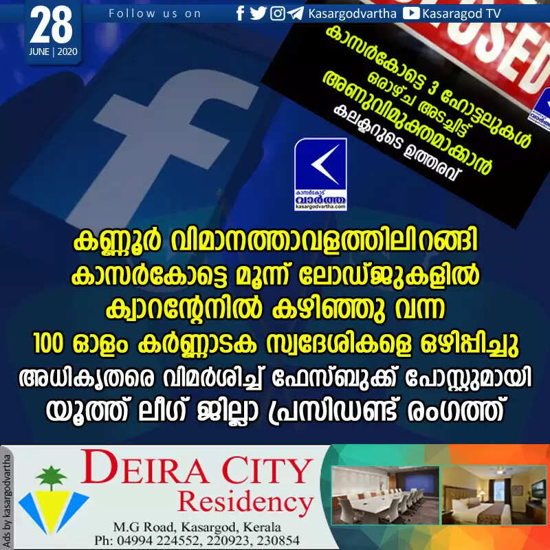 കണ്ണൂര്‍ വിമാനത്താവളത്തിലിറങ്ങി കാസര്‍കോട്ടെ മൂന്ന് ലോഡ്ജുകളില്‍ ക്വാറന്റേനില്‍ കഴിഞ്ഞു വന്ന 100 ഓളം കര്‍ണ്ണാടക സ്വദേശികളെ ഒഴിപ്പിച്ചു; അധികൃതരെ വിമര്‍ശിച്ച് ഫേസ്ബുക്ക് പോസ്റ്റുമായി യൂത്ത് ലീഗ് ജില്ലാ പ്രസിഡണ്ട് രംഗത്ത്