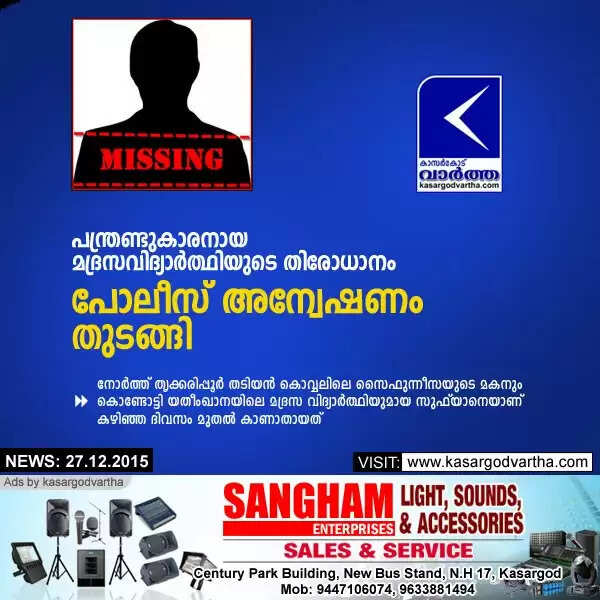 ചെറുവത്തൂര്‍: (www.kasargodvartha.com 27/12/2015) പന്ത്രണ്ടുവയസുകാരനായ മദ്രസാ വിദ്യാര്‍ത്ഥിയെ കാണാനില്ലെന്ന പരാതിയില്‍ പോലീസ് കേസെടുത്ത് അന്വേഷണം തുടങ്ങി.നോര്‍ത്ത് തൃക്കരിപ്പൂര്‍ തടിയന്‍ കൊവ്വലിലെ സൈഫുന്നീസയുടെ മകനും കൊണ്ടോട്ടി യതീംഖാനയിലെ മദ്രസ വിദ്യാര്‍ത്ഥിയുമായ സുഫ്‌യാനെ(12)യാണ് കഴിഞ്ഞ ദിവസം മുതല്‍ കാണാതായത്.