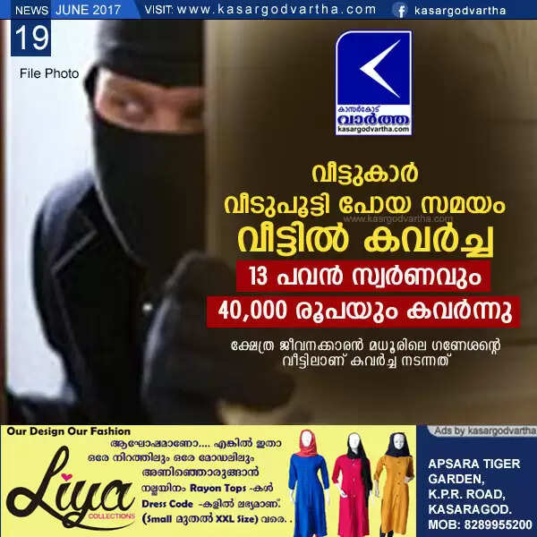 Keywords: Kasaragod, Kerala, House, Robbery, gold, news, 13 sovereign gold robbed from house