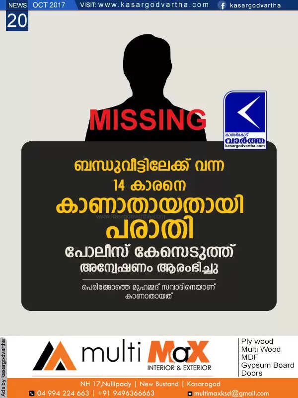 Keywords: News, Kasaragod, Police, Missing, Case, Complaint, Investigation, Relative home, 14 year old goes missing
