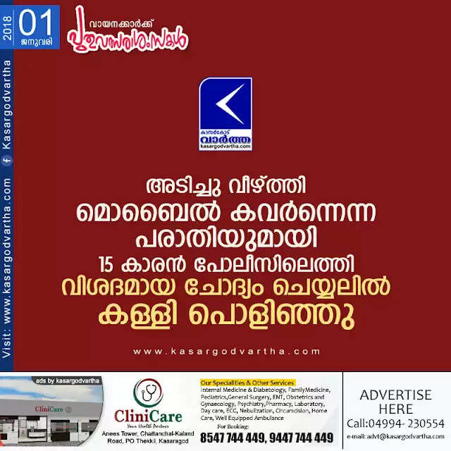 Keywords: Kasaragod, Kerala, news, Police, complaint, mobile, fake, complaint, Vidya Nagar, 15 year old come to police station with Fake complaint.