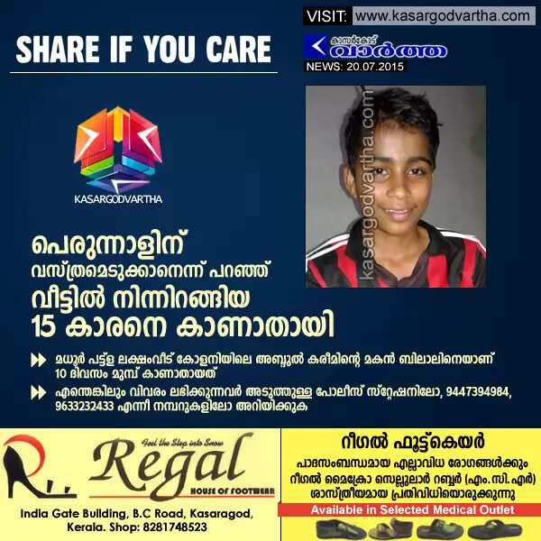 Keywords : Kasaragod, Kerala, Missing, Student, Kozhikode, Police, Investigation, Madhur, Patla, Bilal, 15 year old goes missing.