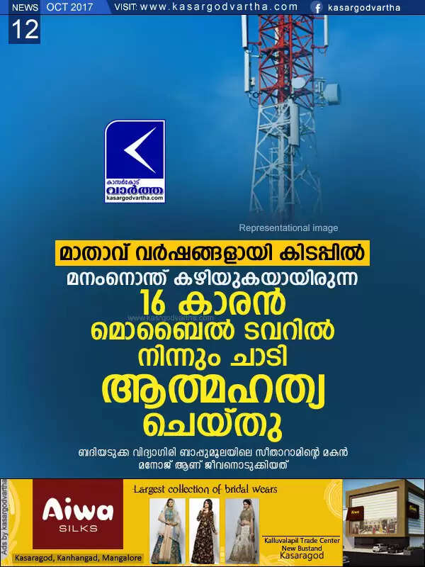 മാതാവ് വര്ഷങ്ങളായി കിടപ്പില്; മനംനൊന്ത് കഴിയുകയായിരുന്ന 16 കാരന് മൊബൈല് ടവറില് നിന്നും ചാടി ആത്മഹത്യ ചെയ്തു