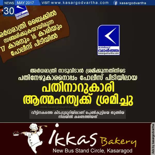 അര്ധരാത്രി നാടുവിടാന് ശ്രമിക്കുന്നതിനിടെ പതിനേഴുകാരനൊപ്പം പോലീസ് പിടിയിലായ പതിനാറുകാരി ആത്മഹത്യക്ക് ശ്രമിച്ചു
