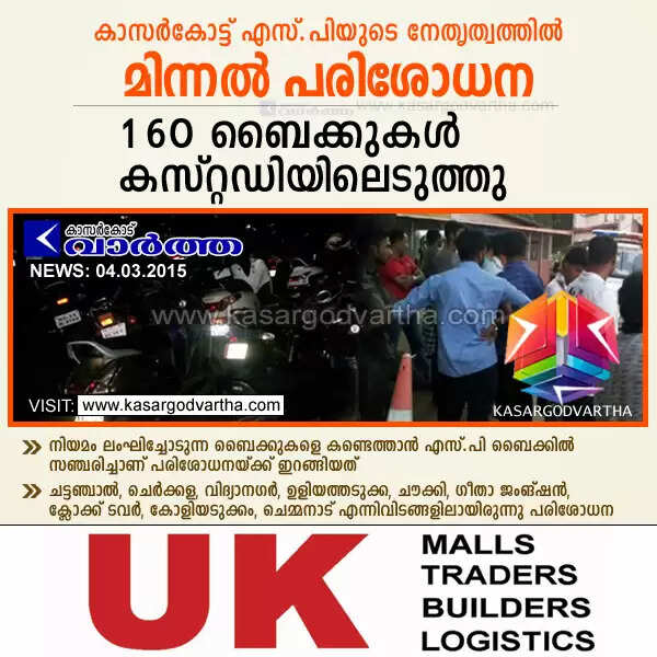 കാസര്കോട്ട് എസ്.പിയുടെ നേതൃത്വത്തില് മിന്നല് പരിശോധന; 160 ബൈക്കുകള് കസ്റ്റഡിയിലെടുത്തു