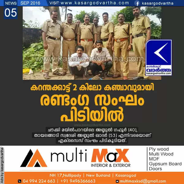 കാസര്‍കോട്: (www.kasargodvartha.com 05/09/2016) കറന്തക്കാട്ട് രണ്ടു കിലോ കഞ്ചാവുമായി രണ്ടംഗ സംഘം എക്‌സൈസിന്റെ പിടിയിലായി. ചൗക്കി മയില്‍പാറയിലെ അബ്ദുല്‍ ഗഫൂര്‍ (40), തായലങ്ങാടി സ്വദേശി അബ്ദുല്‍ ഖാദര്‍ (53) എന്നിവരെയാണ് എക്‌സൈസ് സംഘം പിടികൂടിയത്.