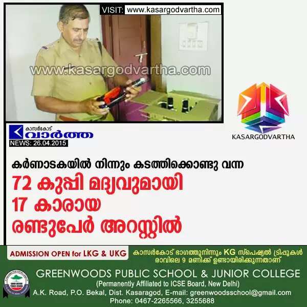 കര്ണാടകയില് നിന്നും കടത്തിക്കൊണ്ടു വന്ന 72 കുപ്പി മദ്യവുമായി 17 കാരായ രണ്ടുപേര് അറസ്റ്റില്