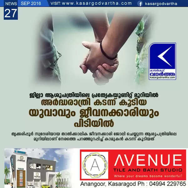 Keywords: Kasaragod, Kerala, Kanhangad, District, hospital, Midnight, employee, Room, Lover, RMO, Police, Job,