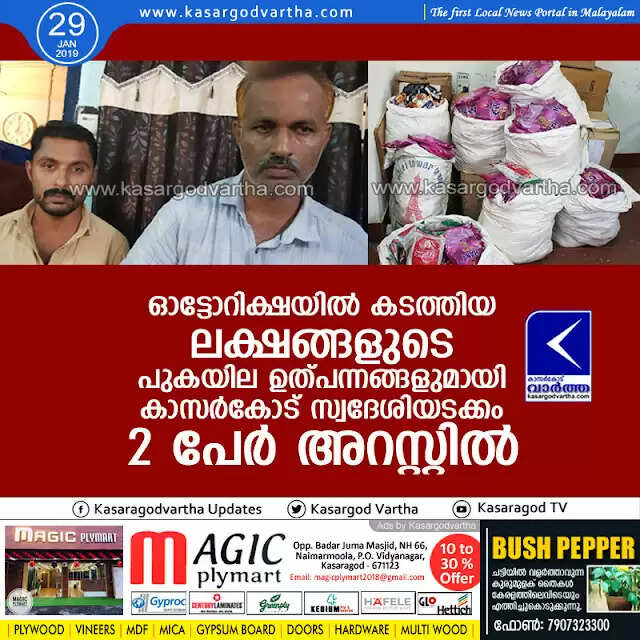 ഓട്ടോറിക്ഷയില്‍ കടത്തിയ ലക്ഷങ്ങളുടെ പുകയില ഉത്പന്നങ്ങളുമായി കാസര്‍കോട് സ്വദേശിയടക്കം 2 പേര്‍ അറസ്റ്റില്‍