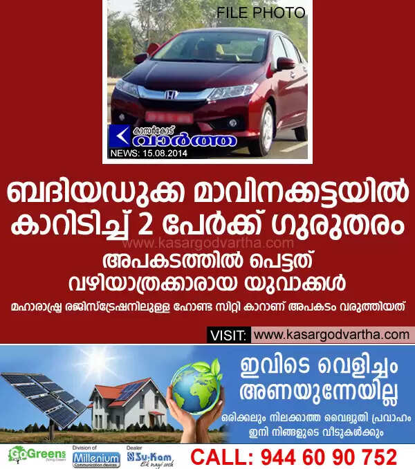 ബദിയഡുക്ക: (www.kasargodvartha.com 15.08.2014) ബദിയഡുക്ക മാവിനക്കട്ടയില് കാറിടിച്ച് വഴിയാത്രക്കാരായ രണ്ട് പേര്ക്ക് ഗുരുതരമായി പരിക്കേറ്റു. വെള്ളിയാഴ്ച ഉച്ചയോടെയാണ് മഹാരാ്ട്ര രജിസ്ട്രേഷനിലുള്ള എം.എച്ച് 43 എന് 5076 നമ്പര് ഹോണ സിറ്റി കാര് വഴി യാത്രക്കാരുടെ ദേഹത്തേക്ക് പാഞ്ഞുകയറിയത്.