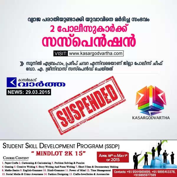 Keywords : Kasaragod, Kerala, Complaint, Police, Suspension, Complaint, Youth, Assault.