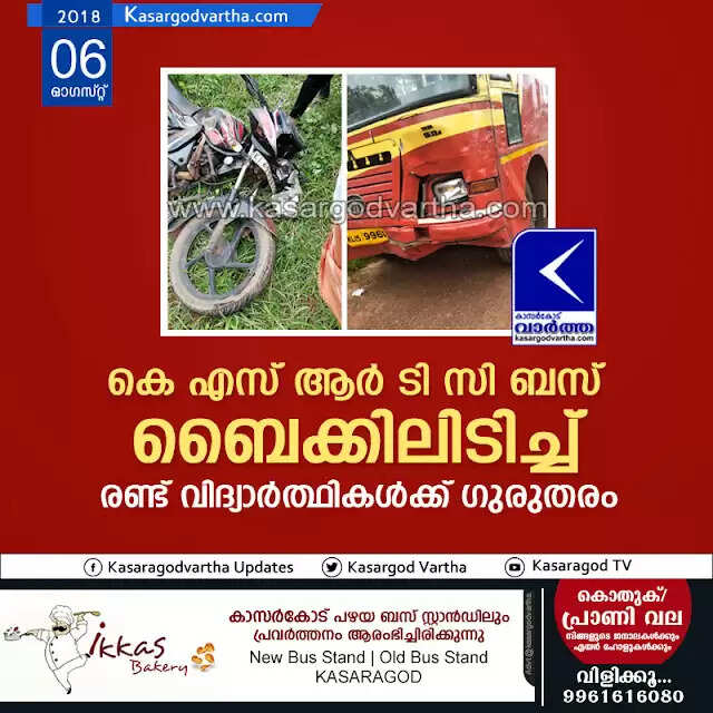 കെ എസ് ആര് ടി സി ബസ് ബൈക്കിലിടിച്ച് രണ്ട് വിദ്യാര്ത്ഥികള്ക്ക് ഗുരുതരം