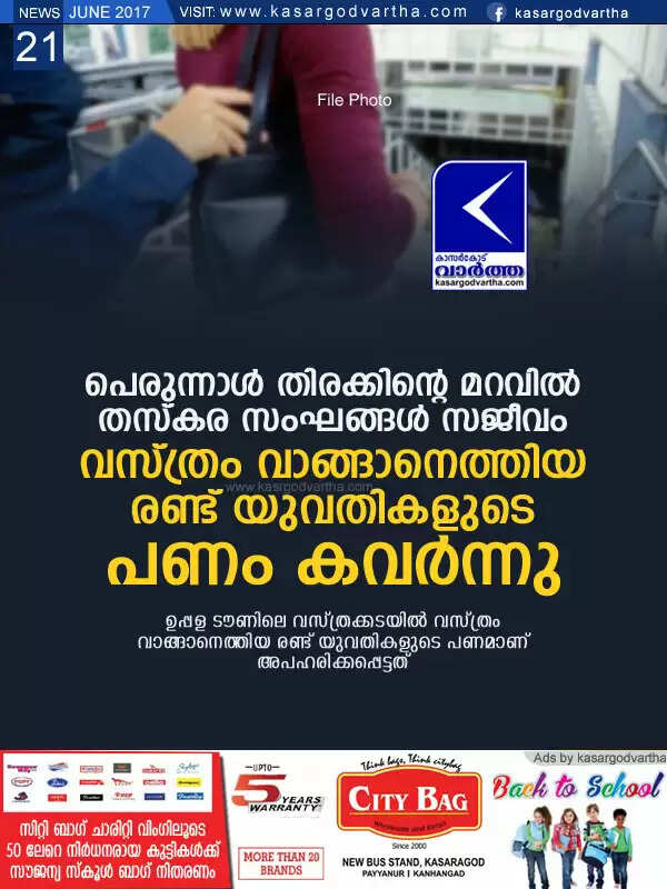 പെരുന്നാള് തിരക്കിന്റെ മറവില് തസ്കര സംഘങ്ങള് സജീവം; വസ്ത്രം വാങ്ങാനെത്തിയ രണ്ട് യുവതികളുടെ പണം കവര്ന്നു