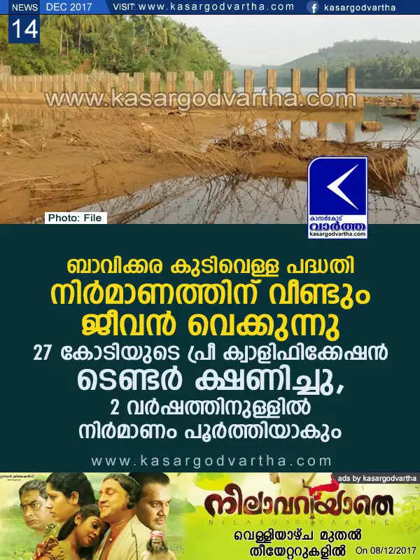 ബാവിക്കര കുടിവെള്ള പദ്ധതി നിര്മാണത്തിന് വീണ്ടും ജീവന് വെക്കുന്നു; 27 കോടിയുടെ പ്രീ ക്വാളിഫിക്കേഷന് ടെണ്ടര് ക്ഷണിച്ചു, 2 വര്ഷത്തിനുള്ളില് നിര്മാണം പൂര്ത്തിയാകും