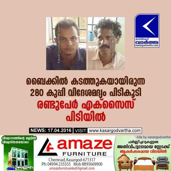 കുമ്പള: (www.kasargodvartha.com 17.04.2016) ബൈക്കില്‍ കടത്തുകയായിരുന്ന 280 കുപ്പി വിദേശമദ്യം എക്‌സൈസ് പിടികൂടി. രണ്ടുപേരെ അറസ്റ്റുചെയ്തു. കുമ്പള മീഞ്ചയിലെ ബേരിക്കയില്‍നിന്നാണ് 180 മില്ലിലിറ്റര്‍ വീതമുള്ള കുപ്പികളിലുള്ള 280 കുപ്പി വിദേശമദ്യം പിടികൂടിയത്. പിടികൂടിയ മദ്യം 50 ലിറ്ററിലേറെ വരും.