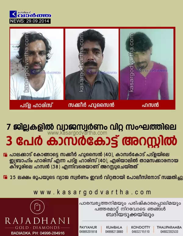 7 ജില്ലകളില് വ്യാജസ്വര്ണം വിറ്റ സംഘത്തിലെ 3 പേര് കാസര്കോട്ട് അറസ്റ്റില്