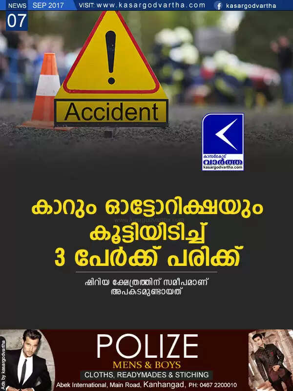 കാറും ഓട്ടോറിക്ഷയും കൂട്ടിയിടിച്ച് 3 പേര്‍ക്ക് പരിക്ക്