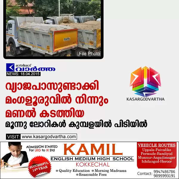 വ്യാജപാസുണ്ടാക്കി മംഗളൂരുവില് നിന്നും മണല് കടത്തിയ മൂന്നു ലോറികള് കുമ്പളയില് പിടിയില്