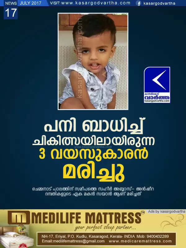 കാസര്‍കോട്: (www.kasargodvartha.com 17.07.2017) പനി ബാധിച്ച് ചികിത്സയിലായിരുന്ന മൂന്ന് വയസുകാരന്‍ മരിച്ചു. ചെമ്മനാട് പാലത്തിന് സമീപത്തെ സഹീര്‍ അബ്ബാസ്- അന്‍ഷീറ ദമ്പതികളുടെ ഏക മകന്‍ സയാന്‍ ആണ് മരിച്ചത്.  www.kasargodvartha.com