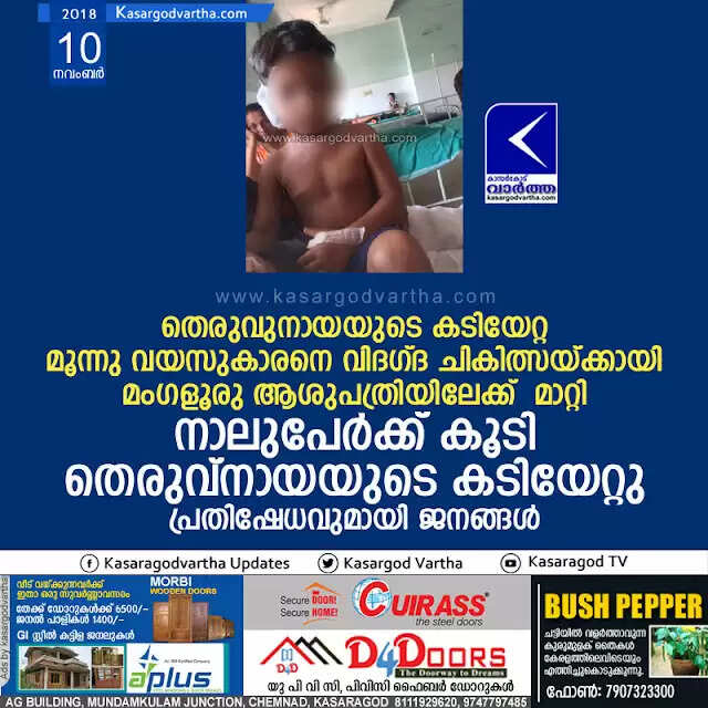 തെരുവുനായയുടെ കടിയേറ്റ മൂന്നു വയസുകാരനെ വിദഗ്ദ ചികിത്സയ്ക്കായി മംഗളൂരു ആശുപത്രിയിലേക്ക് മാറ്റി; നാലുപേര്ക്ക് കൂടി തെരുവ്നായയുടെ കടിയേറ്റു, പ്രതിഷേധവുമായി ജനങ്ങള്