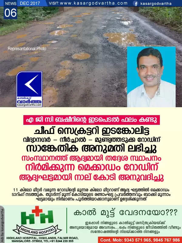 Keywords: Kerala, kasaragod, news, Road, Vidya Nagar, kasaragod, 4 crores allowed for Vidyanagar - Mundyathadukka - Neerchal road