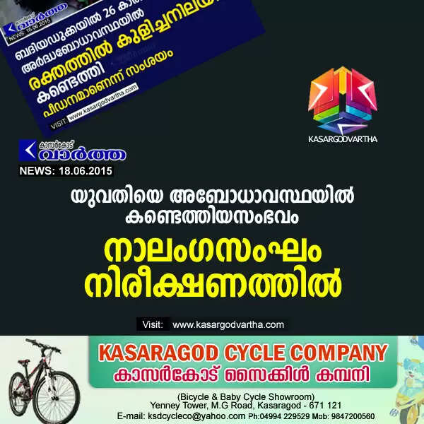 അതിനിടെ ബദിയടുക്ക ബസ് സ്റ്റാന്റില് യുവതിയെ അബോധാവസ്ഥയില് കാണപ്പെട്ട സ്ഥലത്ത് നാലുപേരെ ദുരൂഹസാഹചര്യത്തില് കണ്ടിരുന്നതായി നാട്ടുകാരില് ചിലര് പറയുന്നുണ്ട്. ഇതേകുറിച്ച് പോലീസ് അന്വേഷിക്കുന്നതായും വിവരമുണ്ട്.