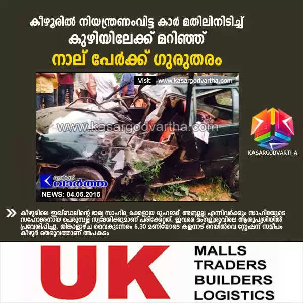 കീഴൂരില് നിയന്ത്രണംവിട്ട കാര് മതിലിനിടിച്ച് കുഴിയിലേക്ക് മറിഞ്ഞ് നാല് പേര്ക്ക് ഗുരുതരം