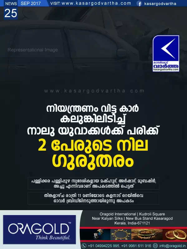നിയന്ത്രണം വിട്ട കാര് കലുങ്കിലിടിച്ച് നാലു യുവാക്കള്ക്ക് പരിക്ക്; 2 പേരുടെ നില ഗുരുതരം