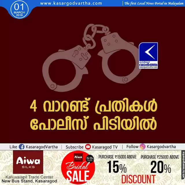 Keywords: Kasaragod, Kerala, news, arrest, Police, Kumbala, 4 warrant case accused arrested