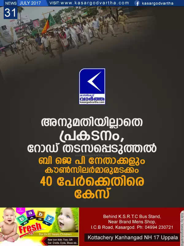 അനുമതിയില്ലാതെ പ്രകടനം, റോഡ് തടസപ്പെടുത്തല്‍; ബി ജെ പി നേതാക്കളും കൗണ്‍സിലര്‍മാരുമടക്കം 40 പേര്‍ക്കെതിരെ കേസ്