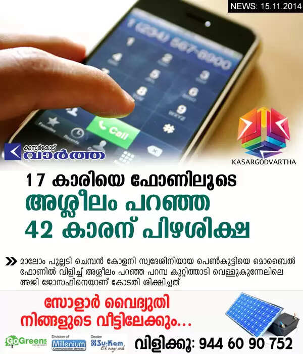 17 കാരിയെ ഫോണിലൂടെ അശ്ലീലം പറഞ്ഞ 42 കാരന് പിഴശിക്ഷ