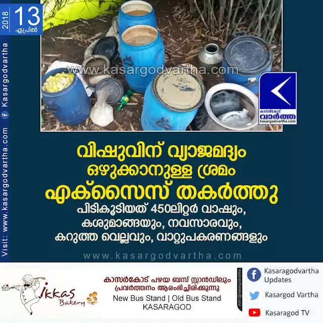 Keywords: Kasaragod, Kerala, News, Chattanchal, Excise, Case, Vishu, Alcohol, Crime, 450 ltr Wash Seized