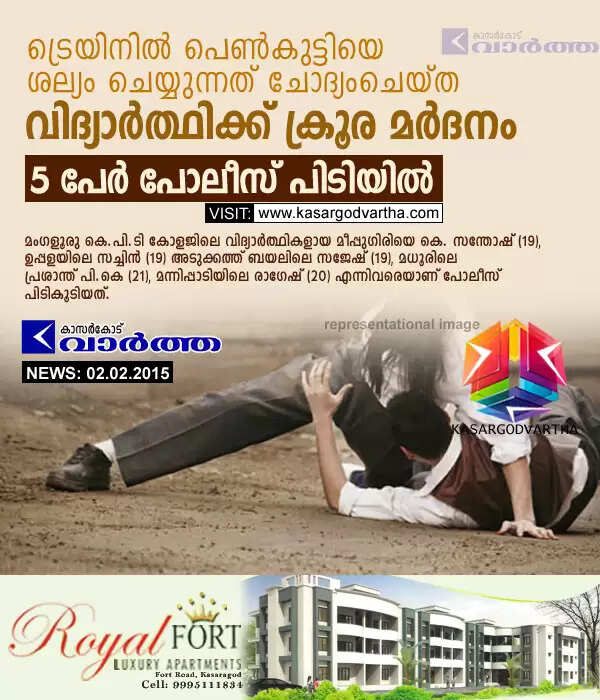 കാസര്കോട്: (www.kasargodvartha.com 02/02/2015) മംഗളൂരുവിലെ സ്വകാര്യ കോളജിലെ വിദ്യാര്ത്ഥിനിയെ ട്രെയിനില് ശല്യപ്പെടുത്തിയത് ചോദ്യം ചെയ്തതിന്റെ പേരില് വിദ്യാര്ത്ഥിയെ ക്രൂരമായി മര്ദിച്ചു. സംഘത്തിലെ അഞ്ച് പേരെ കാസര്കോട് റെയില്വെ പോലീസ് പിടികൂടി.