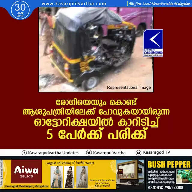 ചെറുവത്തൂര്‍: (www.kasargodvartha.com 30.01.2019) രോഗിയെയും കൊണ്ട് ആശുപത്രിയിലേക്ക് പോവുകയായിരുന്ന ഓട്ടോറിക്ഷയില്‍ കാറിടിച്ച് അഞ്ചു പേര്‍ക്ക് പരിക്കേറ്റു. ഓട്ടോഡ്രൈവര്‍ ഏറ്റുകുടുക്കയിലെ വിനീഷ്, യാത്രക്കാരായ മനോജ്, കല്യാണി, നാരായണി, ബാലാമണി എന്നിവര്‍ക്കാണ് പരിക്കേറ്റത്.