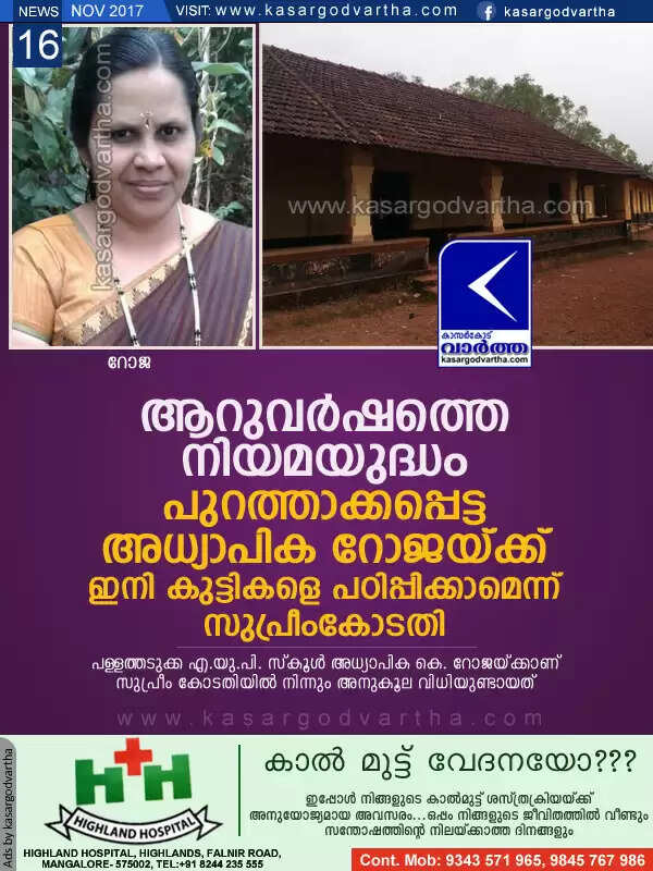 Keywords:  Kasaragod, Kerala, news, court, complaint, Teacher, 6 years legal battle; Supreme Court orders to appoint Roja as teacher