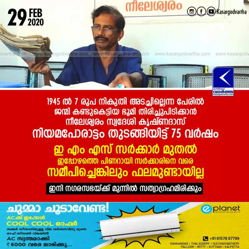 1945 ല് 7 രൂപ നികുതി അടച്ചില്ലെന്ന പേരില് ജന്മി കണ്ടുകെട്ടിയ ഭൂമി തിരിച്ചുപിടിക്കാന് നീലേശ്വരം സ്വദേശി കൃഷ്ണദാസ് നിയമപോരാട്ടം തുടങ്ങിയിട്ട് 75 വര്ഷം; ഇ എം എസ് സര്ക്കാര് മുതല് ഇപ്പോഴത്തെ പിണറായി സര്ക്കാരിനെ വരെ സമീപിച്ചെങ്കിലും ഫലമുണ്ടായില്ല, ഇനി നഗരസഭയ്ക്ക് മുന്നില് സത്യാഗ്രഹമിരിക്കും