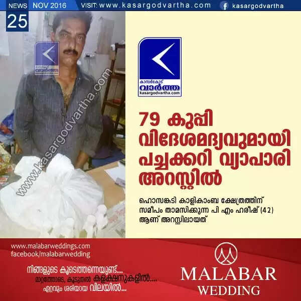 മഞ്ചേശ്വരം:  (www.kasargodvartha.com 25/11/2016) ഹൊസങ്കടി റെയില്‍വേ ഗേറ്റിന് സമീപം മദ്യ വില്‍പന നടത്തുകയായിരുന്ന പച്ചക്കറി വ്യാപാരിയെ പോലീസ് അറസ്റ്റുചെയ്തു. ഹൊസങ്കടി കാളികാംബ ക്ഷേത്രത്തിന് സമീപം താമസിക്കുന്ന പി എം ഹരീഷ് (42) ആണ് അറസ്റ്റിലായത്. ഇയാളില്‍നിന്നും 79 കുപ്പി കര്‍ണാടക മദ്യം പിടിച്ചെടുത്തു. വ്യാഴാഴ്ച വൈകിട്ട് ഏഴ് മണിയോടെയാണ് പ്രതി പിടിയിലായത്.