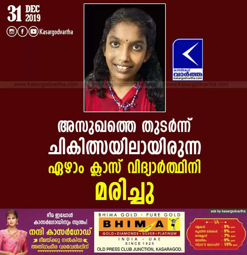Keywords: news, Kerala, kasaragod, Bovikanam, Cherkala, Student, died, Teacher, Treatment, A seventh Standard student who was being treated for her illness died