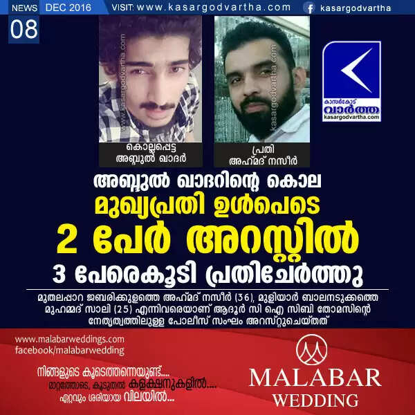 അബ്ദുല് ഖാദറിന്റെ കൊല: മുഖ്യപ്രതി ഉള്പെടെ രണ്ടുപേര് അറസ്റ്റില്; 3 പേരെകൂടി പ്രതിചേര്ത്തു