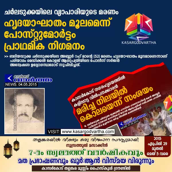 ചര്ലടുക്കയിലെ വ്യാപാരിയുടെ മരണം ഹൃദയാഘാതം മൂലമെന്ന് പോസ്റ്റുമോര്ട്ടം പ്രാഥമിക നിഗമനം