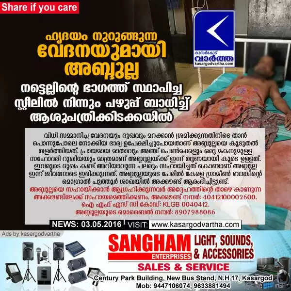 കാസര്‍കോട്: (www.kasargodvartha.com 03/05/2016) ഏഴുവര്‍ഷം മുമ്പ് ജോലിക്കിടെ കെട്ടിടത്തില്‍ നിന്നും വീണ് ഉള്ളാളിലെ ഉമ്മറബ്ബയുടെ മകന്‍ അബ്ദുല്ല എന്ന 34 കാരന്‍ ഹൃദയം നുറുങ്ങുന്ന വേദനയുമായി കാസര്‍കോട്ടെ സര്‍ക്കാര്‍ ആശുപത്രിയില്‍ കഴിയുന്നു. നട്ടെല്ലിന്റെ ഭാഗത്ത് സ്ഥാപിച്ച സ്റ്റീലില്‍ നിന്നും പഴുപ്പ് കിഡ്‌നിയിലേക്ക് അരിച്ചുകയറുമ്പോള്‍ വേദന കടിച്ചമര്‍ത്തുന്നതിനിടയില്‍ അറിയാതെ കണ്ണുനീര്‍ വാര്‍ന്നൊഴുകുന്നു. കൂട്ടിന് താങ്ങും തണലുമാകേണ്ട ഭാര്യ ഭര്‍ത്താവിന്റെ ഈ അവസ്ഥ കണ്ട് കണ്ണില്‍ ചോരയില്ലാതെ ഏഴ് വയസുള്ള മകനെയും കൂട്ടി പുതിയ മേച്ചില്‍പുറം തേടിപ്പോയി.